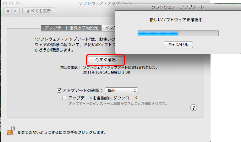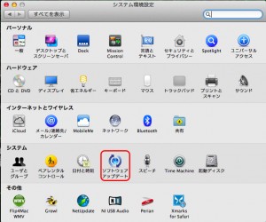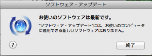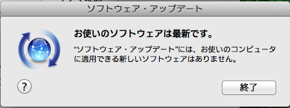(1)ソフトウェアアップデートでMacの環境を最新にする 投稿日:2011年10月16日 作成者: admin 1.『システム環境設定』を起動 2.『ソフトウェアアップデート』をクリック 3.すぐに下図の画面になるかもしれないけど、ならなかったら『今すぐ確認』をクリックすればOK 4.ここで、アップデートするものがあればそれが表示されるのですべてをインストールする。 5.インストールが完了したら念の為、3.の『今すぐ確認』をクリックする。 6.すべてのインストールが完了してれば下図のウィンドウが表示される。この状態でOKなので『終了』をクリック。