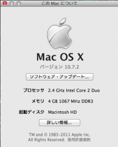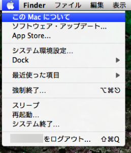 (2)OS Xのバージョンを確認する 投稿日:2011年10月16日 作成者: admin これはやり方もう知ってるよね… 1.マーク → 『このMacについて』をクリック 2.今だと『バージョン 10.7.2』になってる事を確認、なってればOK。