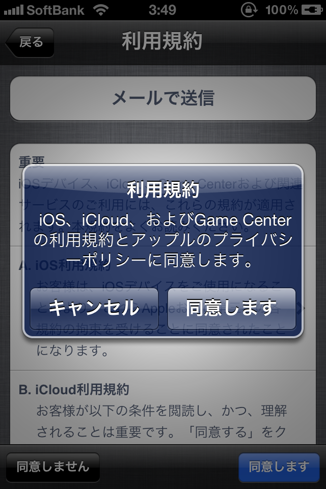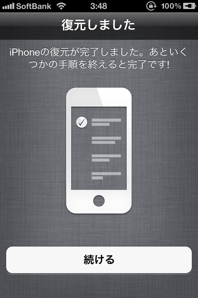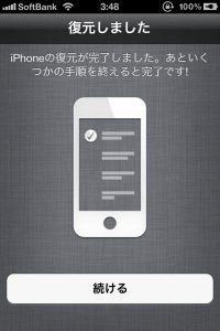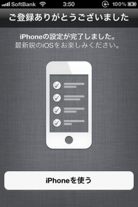 iOS5へのアップデートが済んだら、MacにiPhoneを接続したまま、下記の順番で画面に従って進めて行くと晴れて使えるようになるよ。ここまで来るのには長い…