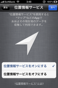 ※後で個別のアプリでオン・オフが切り替えられる。やり方は『設定』→『位置情報サービス』をクリックすれば中に対応アプリの名前が一覧で出るのでオン・オフを切り替えればOK。