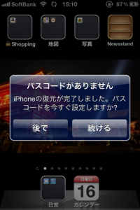この画面の後だったと思うんだけど、『パスコードが設定されてません』ってのが表示されるのでパスコード設定してね(画面のロックを解除するやつ ー これは引き継がれないみたい。