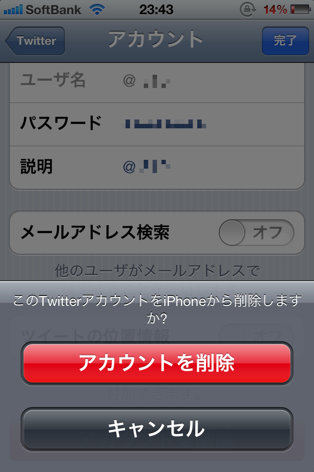 5.確認のダイアログが出るので、「アカウントの削除」をタップ。