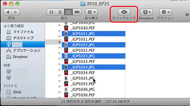 2.1個でもいいし、複数でもいいけど、複数の方が便利度が増すので複数選んでみよう。通常、複数選択する場合は”Shift+クリック”で選択するけど、これだと連続してファイルが選択される。下図のように、1個おきに選択するとか、離れた場所のファイルを同時に選択する場合は”⌘(commmand)+クリック”で選択出来るよ。で、選択したら目玉のマーク「クイックルック」をクリック(キーボードで”⌘+Y”と打っても同じ事が出来る)