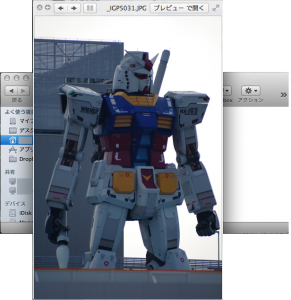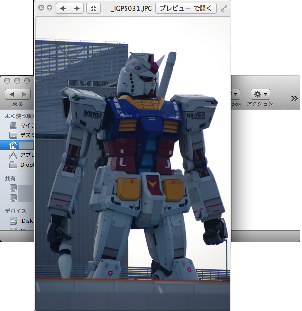 これ、何が便利かって言うと、わざわざアプリ(写真だとiPhotoとか)を起動させずにファイルの中身が確認出来る!アプリを起動させると起動に時間がかかるけど、このクイックルックの場合は選んで即見られる。ただし、ファイルサイズの大きいものはそれなりに時間かかるかもしれないけど、アプリを起動するよりはずっと早い。しかも・・・今回は写真ファイルにしたけど、動画ファイルを選択した場合は動画が見られるし、音楽ファイルを選択すると音楽が再生されたり、WordやExcel、PDFのファイルも中身が見られたりと、とにかく対応してるファイルであればなんでも中身が確認出来てしまうスグレもの。個別のアプリを起動させる事無く中身の確認が出来る簡易ビューワってとこかな。とにかく便利!