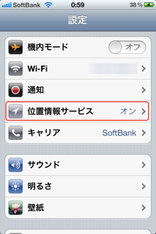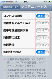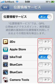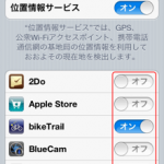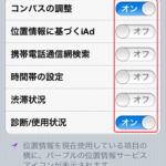 2.一番上の「位置情報サービス」をオフにしちゃうと、マップとかに影響しちゃうのでここはオンのまま。下の方にスクロールしてくと位置情報に対応したアプリが並んでるので個別に必要無いものをオフにする。